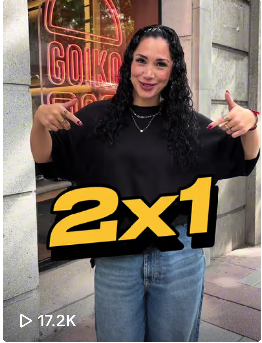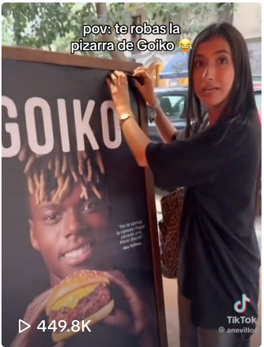 Para empezar, el robo del cartel de Nico Williams. Dos chicas se robaron el cartel de Goiko, la publicación original alcanzó los 3M de views en medos de 48 horas. (Tiktok borró el primer vídeo). Nosotros decidimos aprovechar el momento tan viral e hicimos un challenge que resultó todo un éxito, repartimos más de 100 códigos de hamburgesa gratis por toda España. Aquí marca un antes y un después en mi carrera profesional, ya que por pimera vez, manejo una cuenta oficial de Instagram con +500K de seguidores y TikTok con una comunidad de +60K.